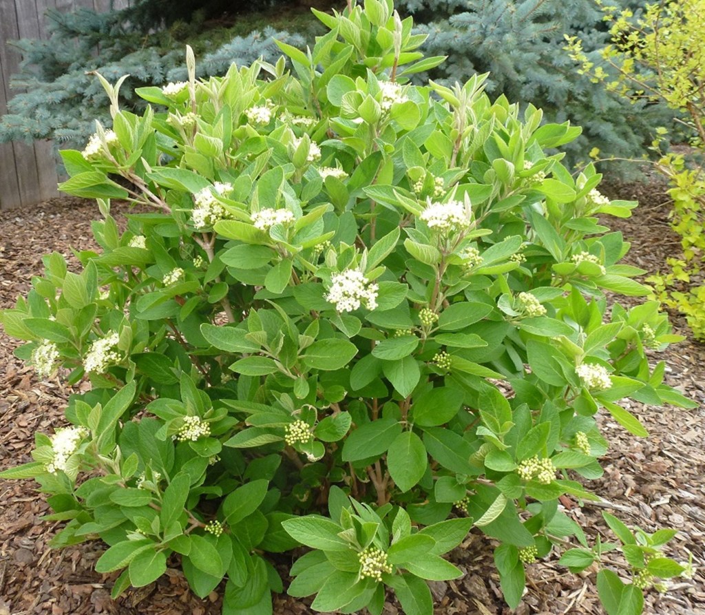 - This is a very useful dwarf shrub that matures to about 4 to 6 feet in height and width with darker green foliage that turns burgundy in the fall. It has white flowers in May that develop into persistent red to black fruit in fall into winter. Hardy to Zones 4 to 9.