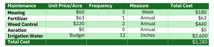 They chose a blue grama and buffalograss native grass mix and in the second year of this project reduced their watering and maintenance by 56% (see table below). This alternative water wise landscape shifted water use from 24 inches per watering season to 12 inches and that’s just the beginning of the story. Maintenance costs also decreased tremendously after establishment.