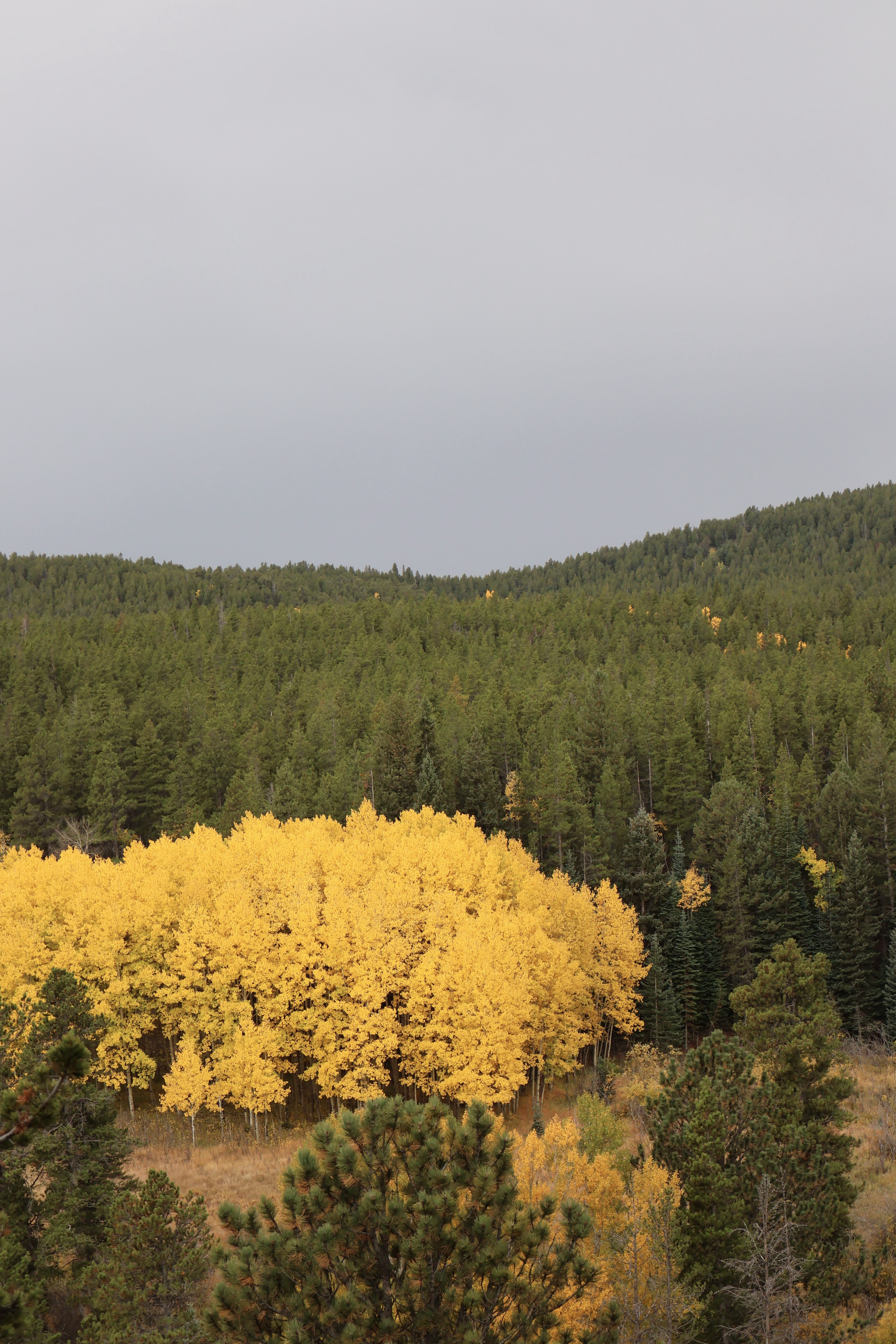 This beautiful contrast only happens around fall time, though. Around the autumn equinox, September 22 for the year 2025, the green leaves of aspens start to turn into a vibrant yellow, leaving a striking glow in the Colorado mountains.